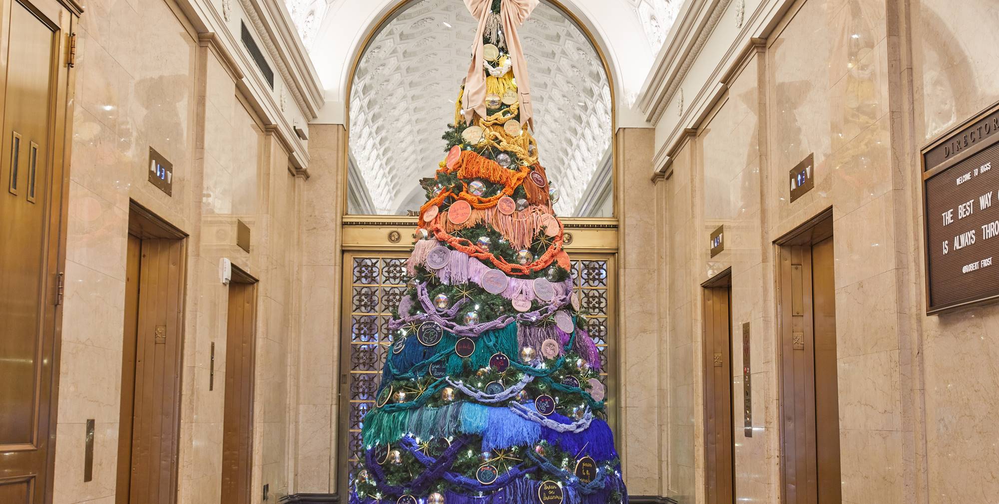 This year, the luxurious Riggs Hotel is showcasing a truly unique 18-foot tree, a collaboration between Farrow & Ball and fashion designer Christopher John Rogers. Adorned with geometric wallpaper prints and oversized bows made from hand-painted paper strips, this tree is a feast for the eyes. Keep an eye out for whimsical ornaments inspired by Farrow & Ball paint names, like blue lobster and pink shallots.